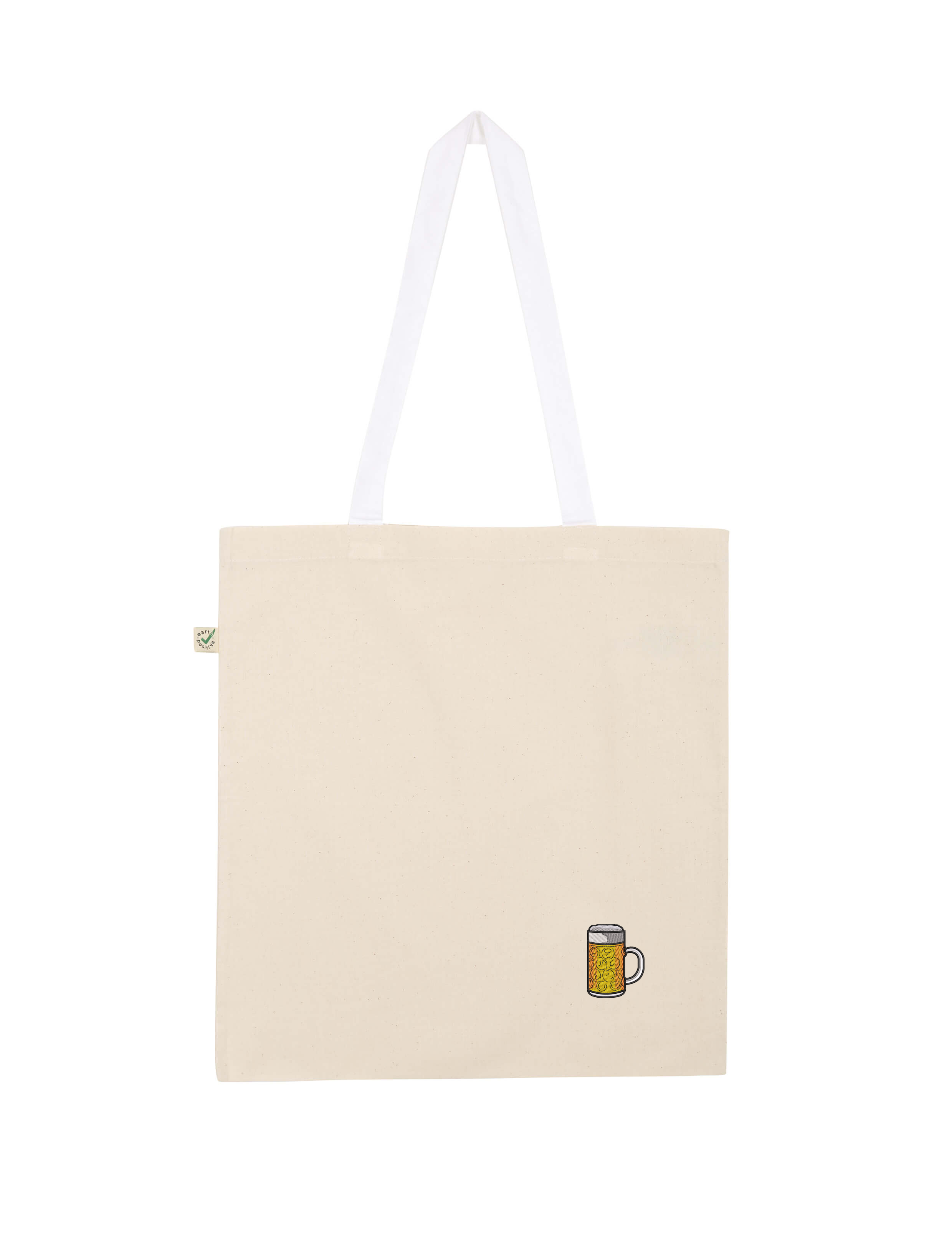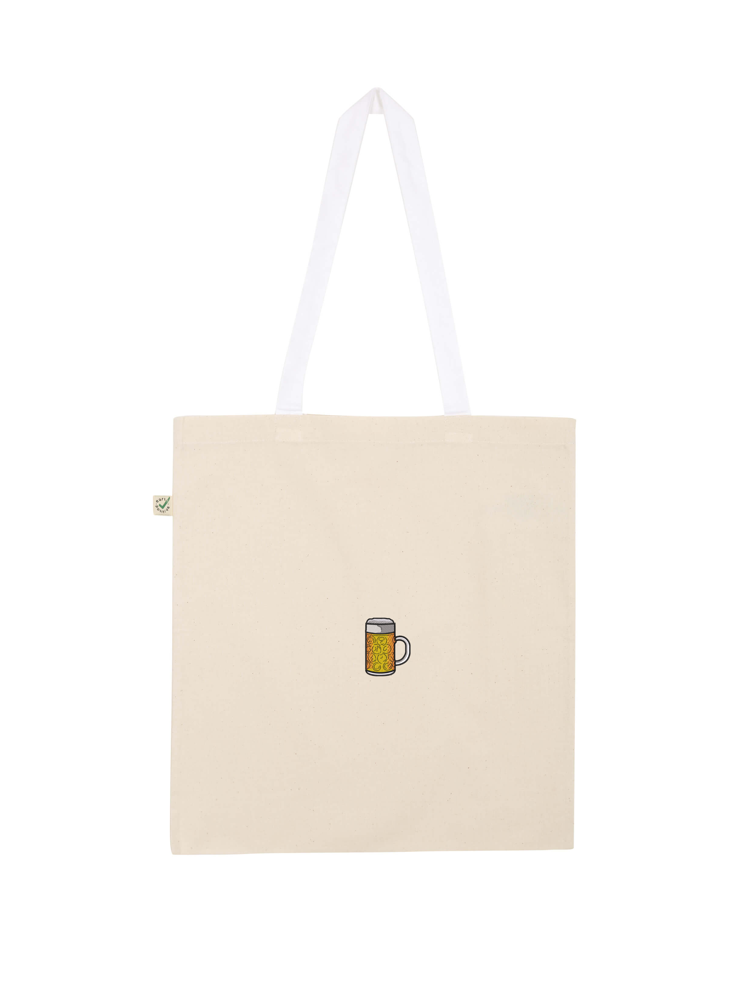 Bestickte, fair produzierte Bio-Baumwoll-Tragetasche im Maßkrug Design.