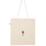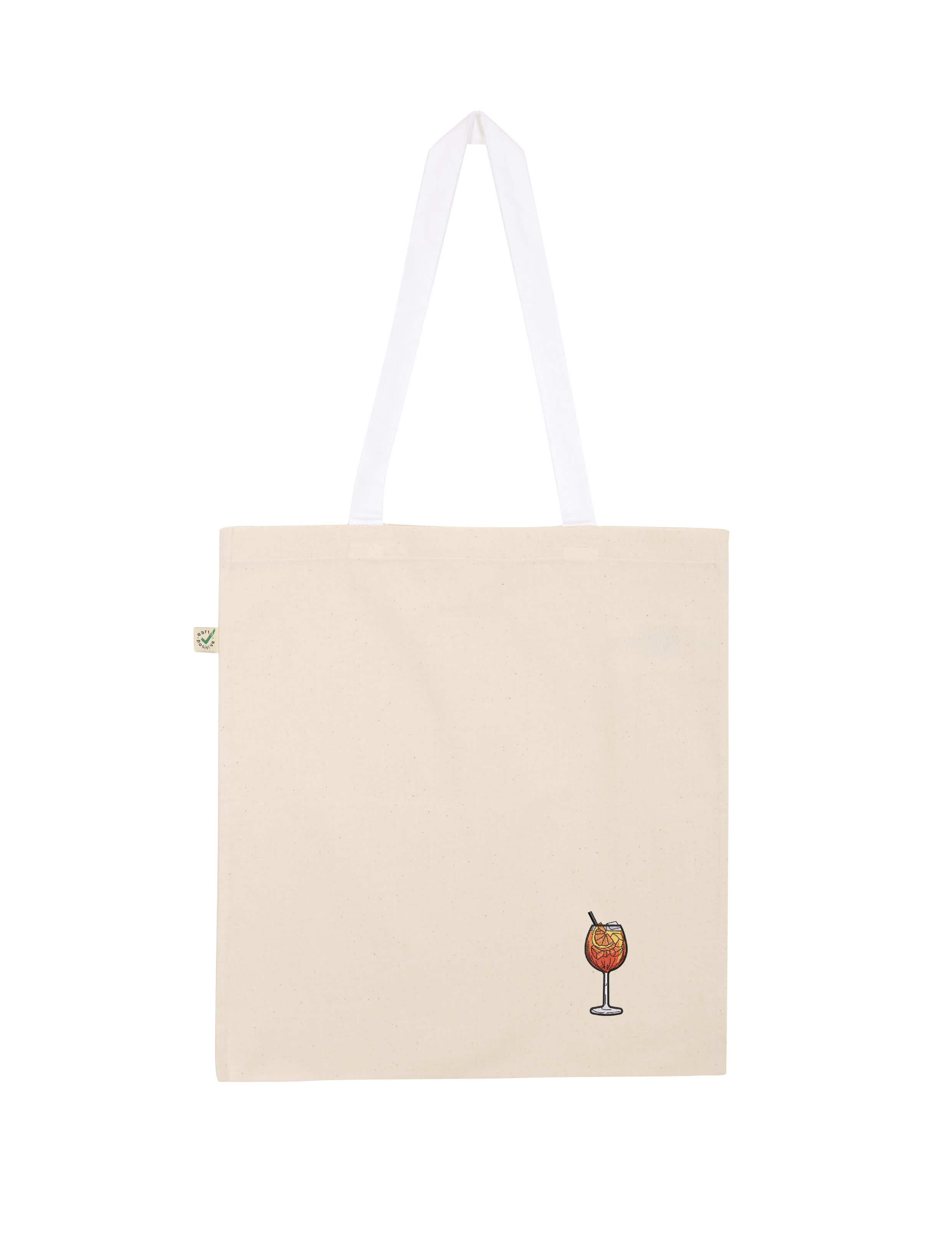 Bestickte, fair produzierte Bio-Baumwoll-Tragetasche im Spritz Design.