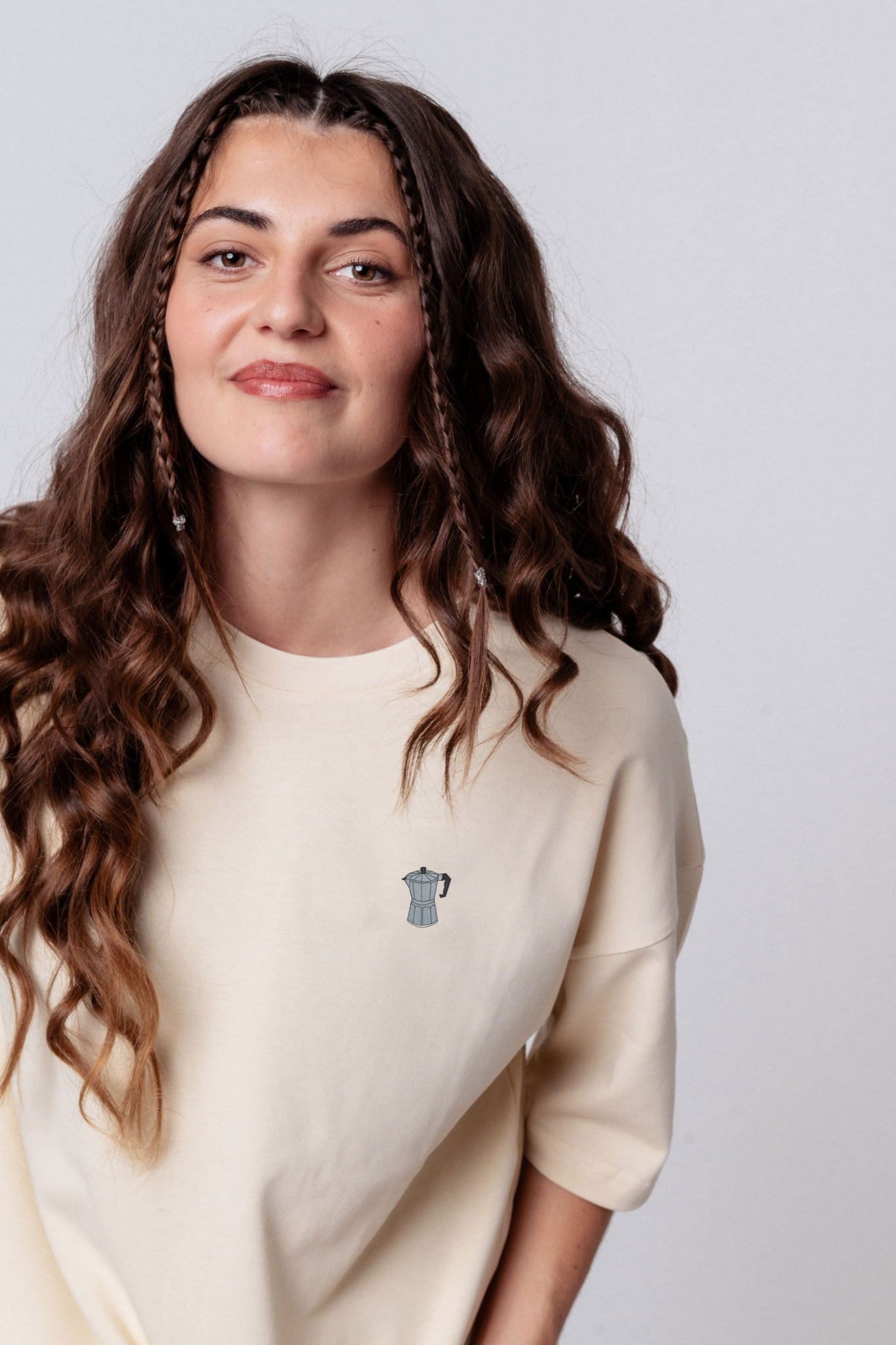 Heavy Oversized Bio Baumwoll T-Shirt mit extra schwerem Stoff (230gsm) und gesticktem Espressokocher Design