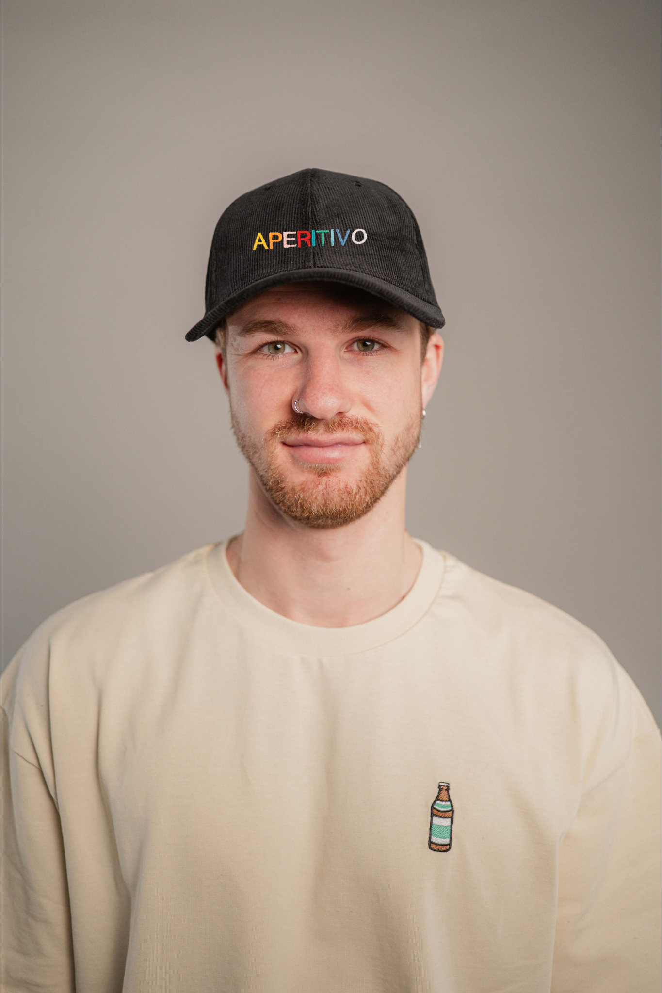 Super hochwertige Cord Cap aus 100% Bio Baumwolle mit gesticktem Aperitivo Schriftzug vorne und kleinem gesticktem Spritz Glas seitlich