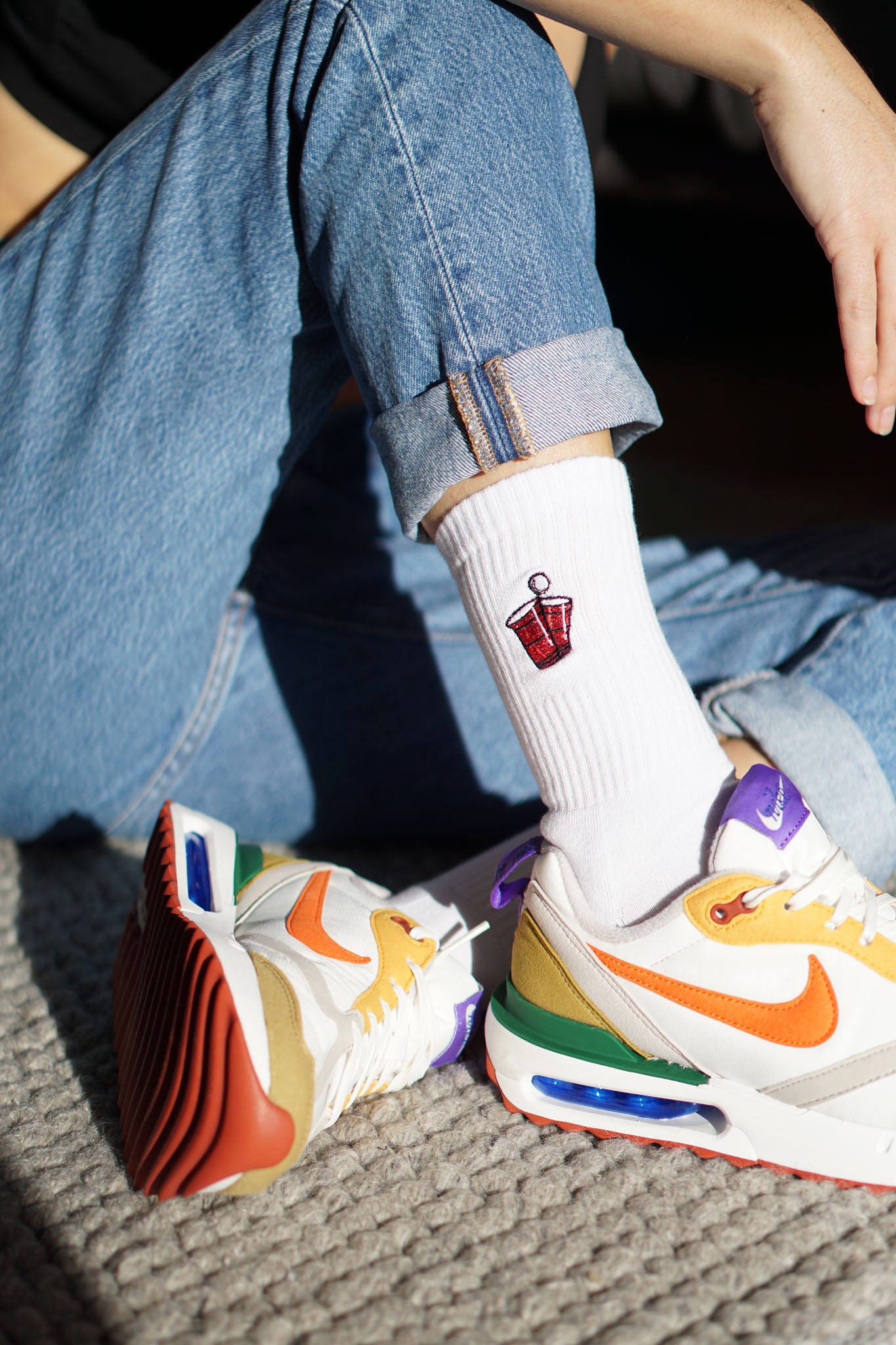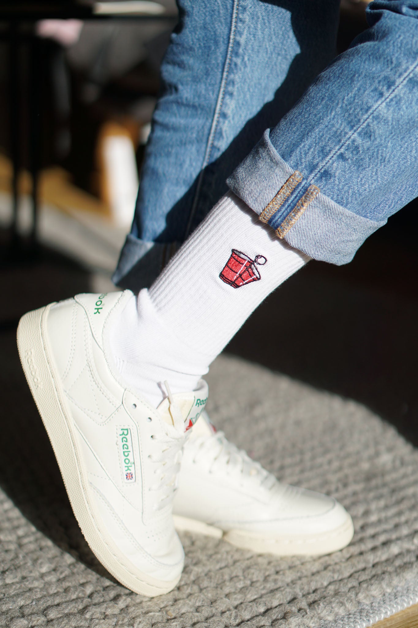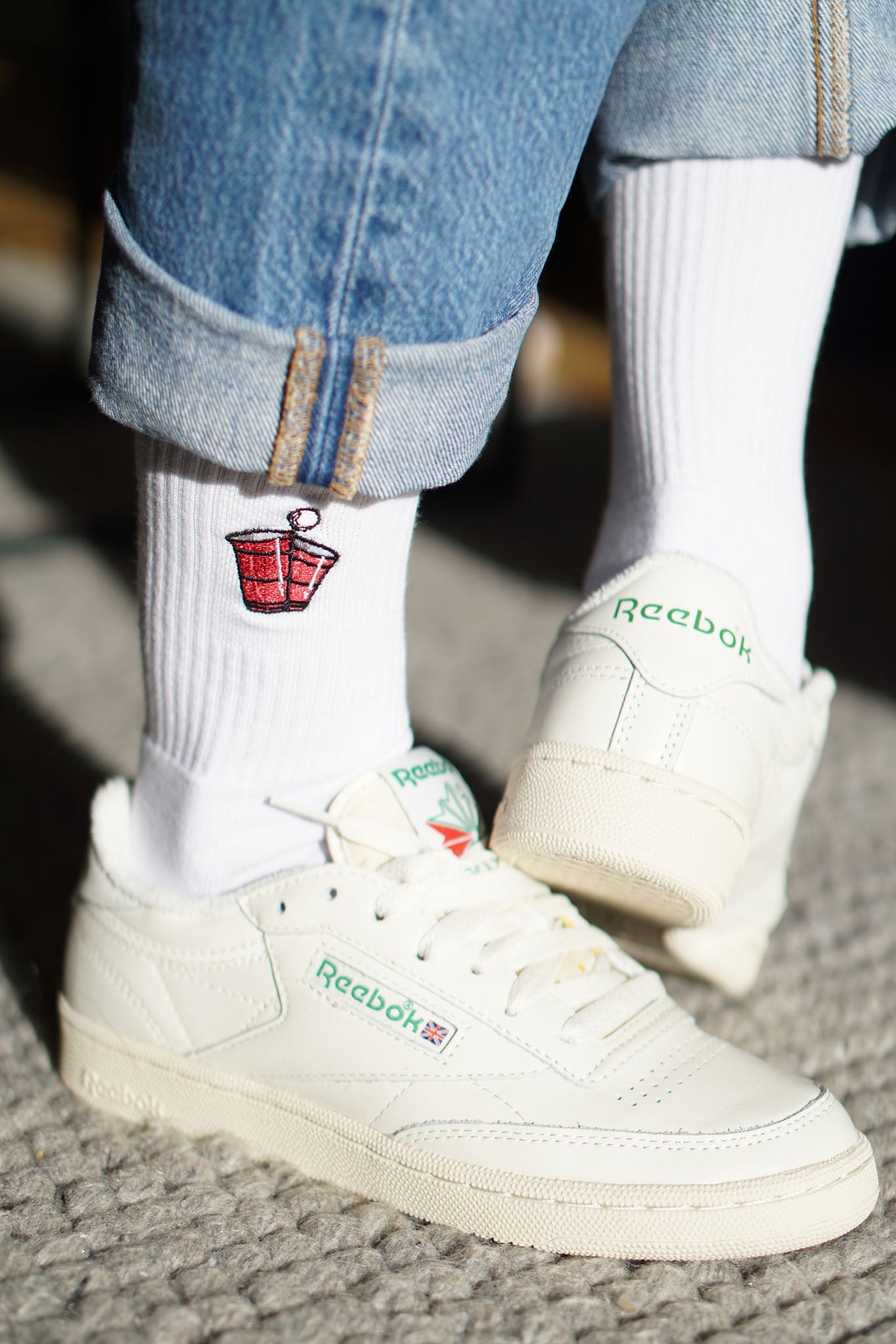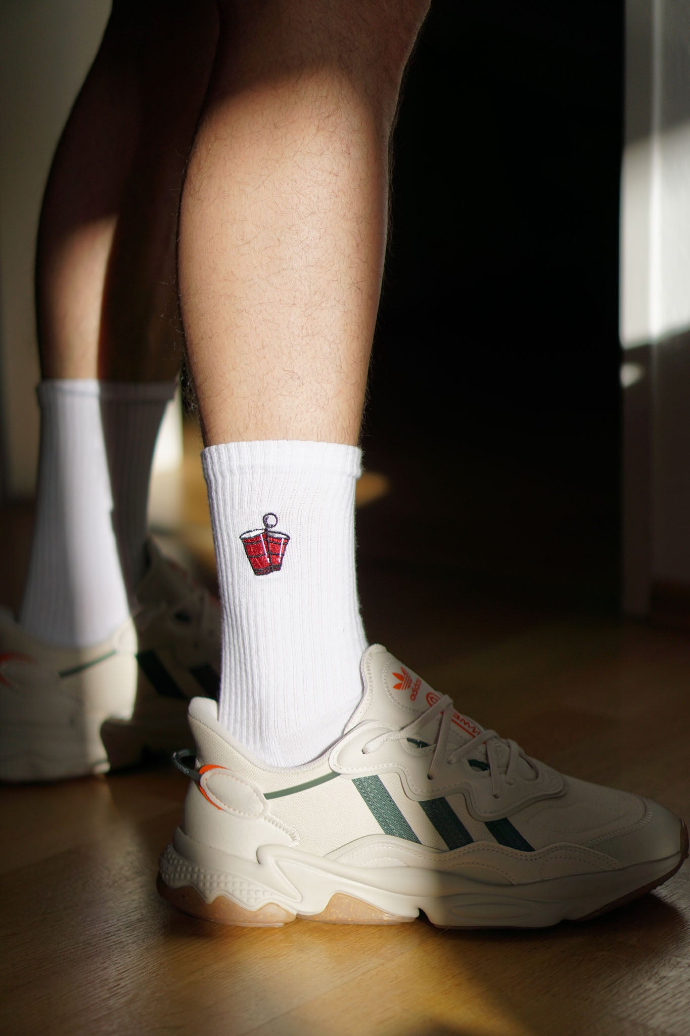 Super hochwertige Bio Baumwoll Crew Socken mit gesticktem Beerpong Design