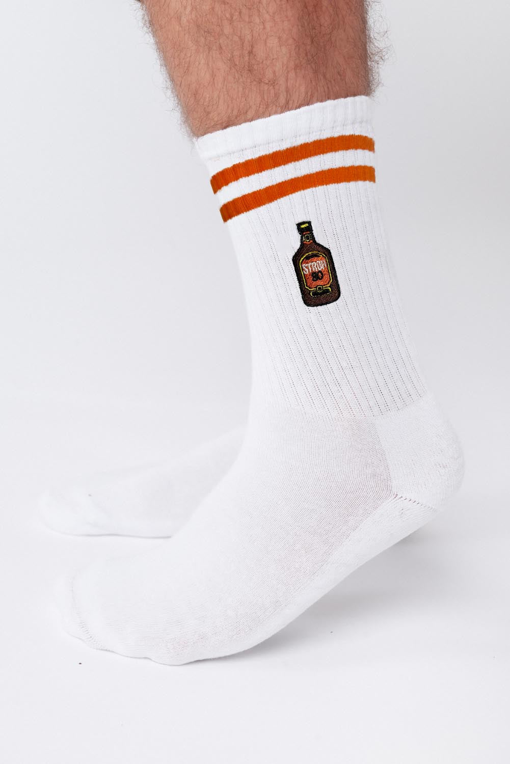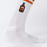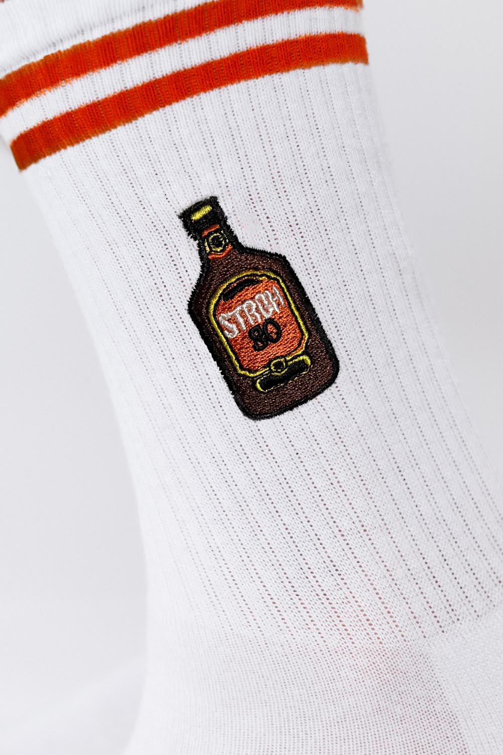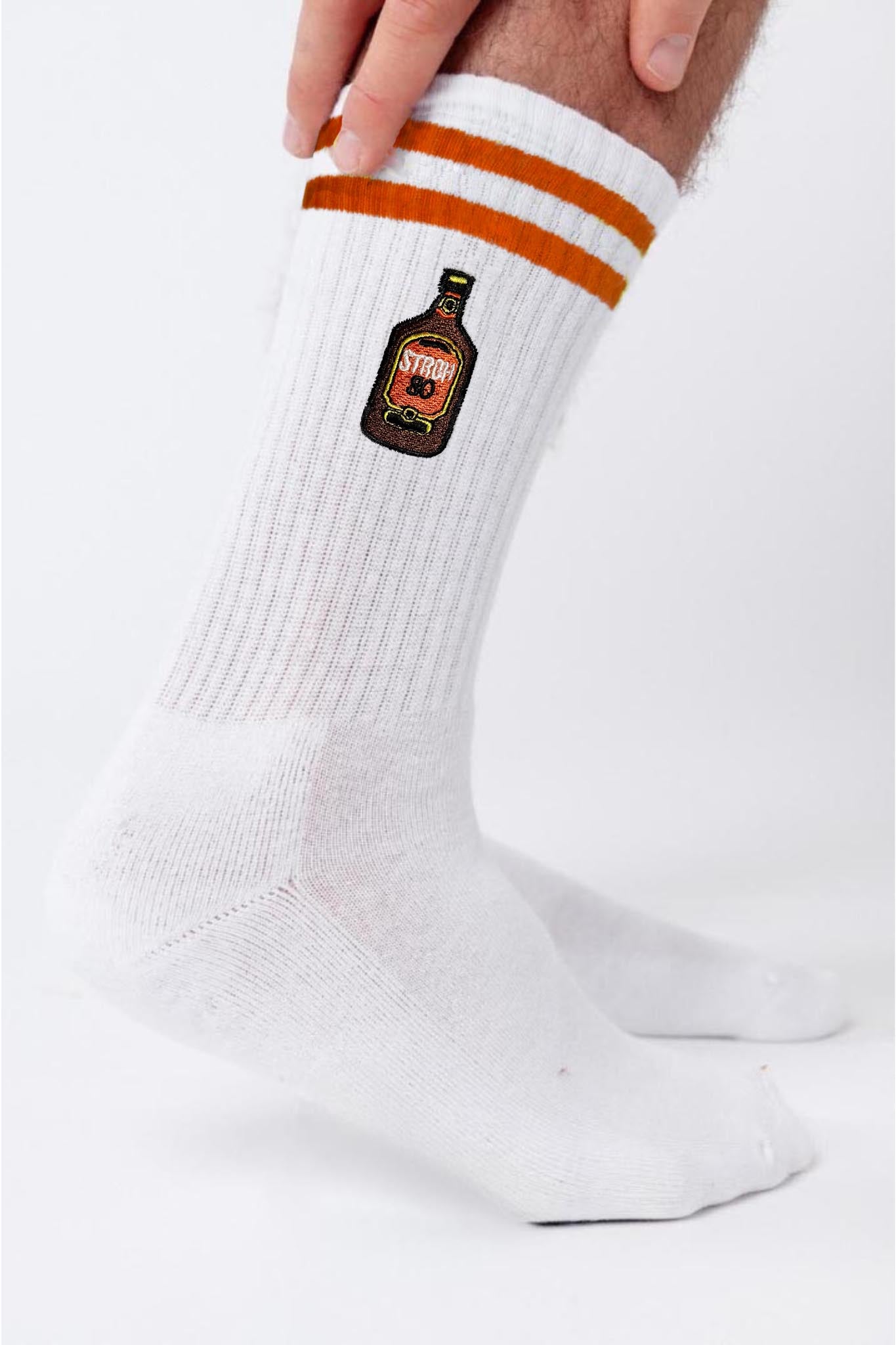 Super hochwertige Bio Baumwoll Crew Socken mit offiziell gesticktem Stroh 80 Design und orangenen Streifen