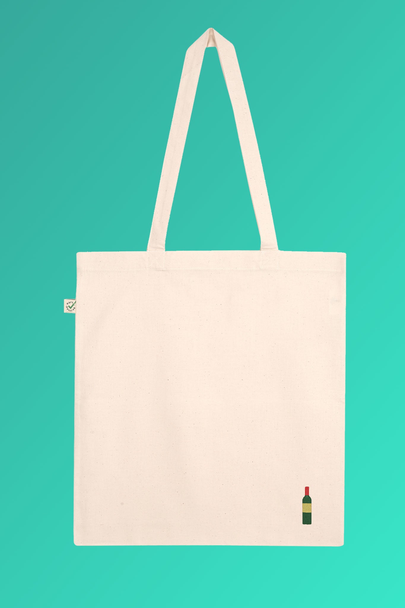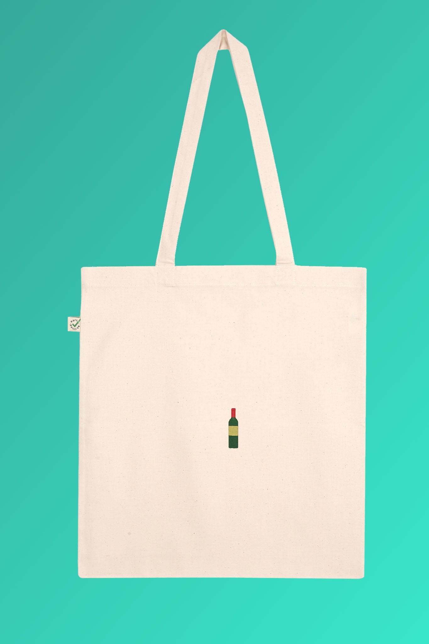 Bestickte, fair produzierte Bio-Baumwoll-Tragetasche im Weinflaschen Design.
