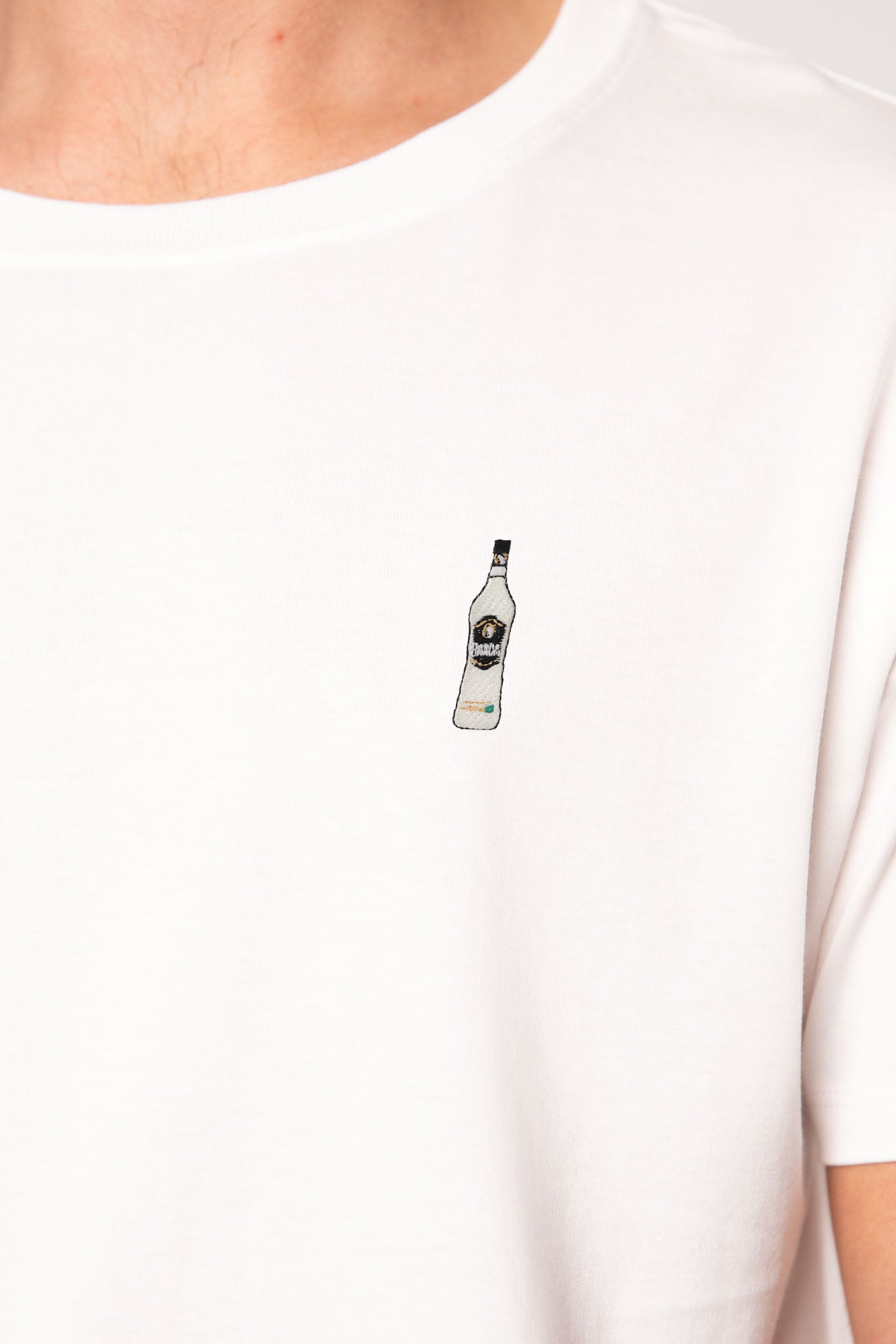 Besticktes Bio Baumwoll Unisex T-Shirt mit schwerem Stoff (190gsm) und der offiziellen gestickten Mangaroca Batida de Côco® Flasche
