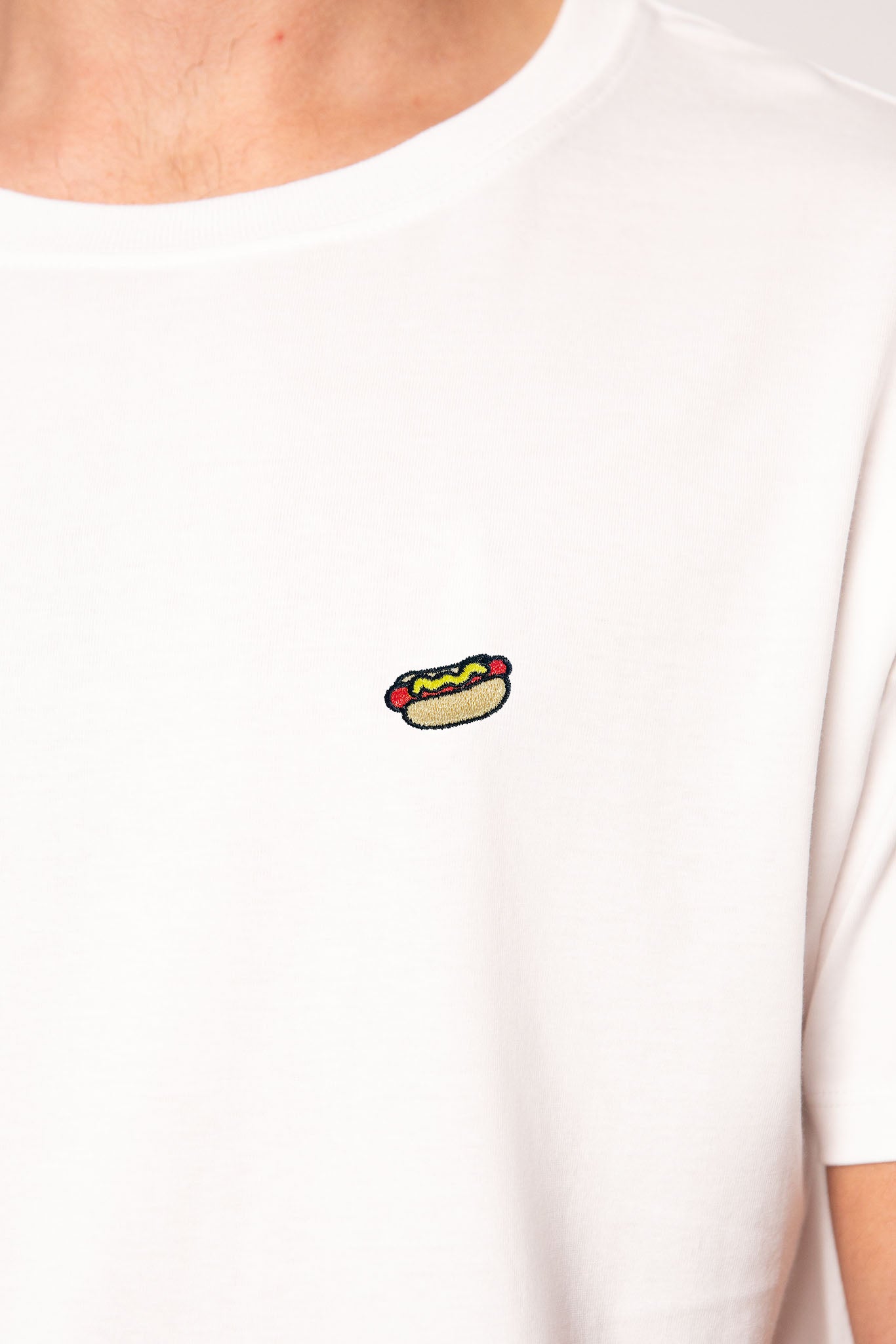 Besticktes Bio Baumwoll Unisex T-Shirt mit schwerem Stoff (190gsm) und gesticktem Hot Dog Design