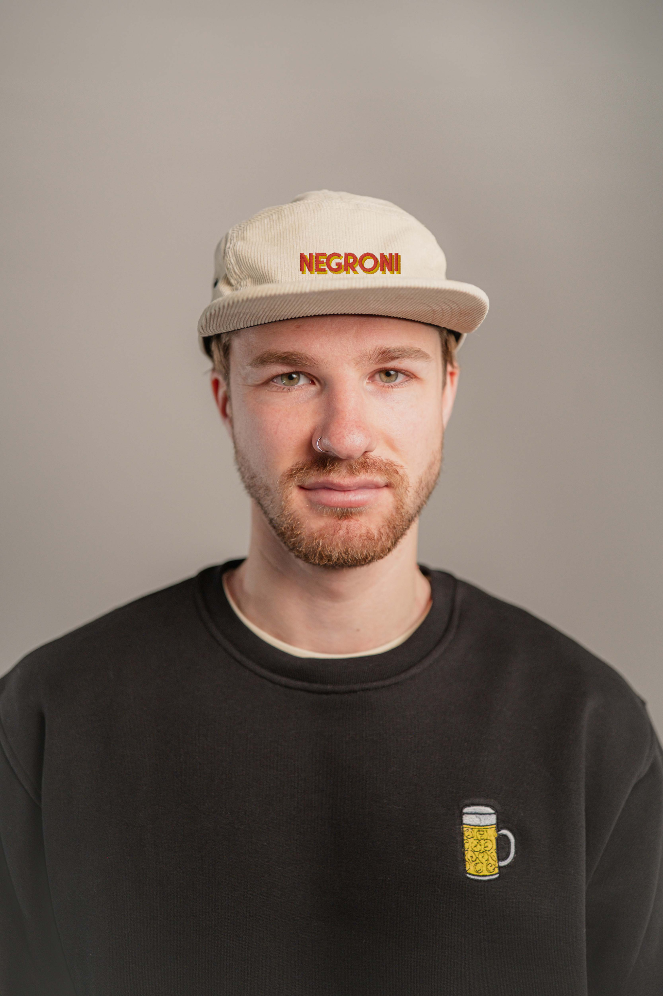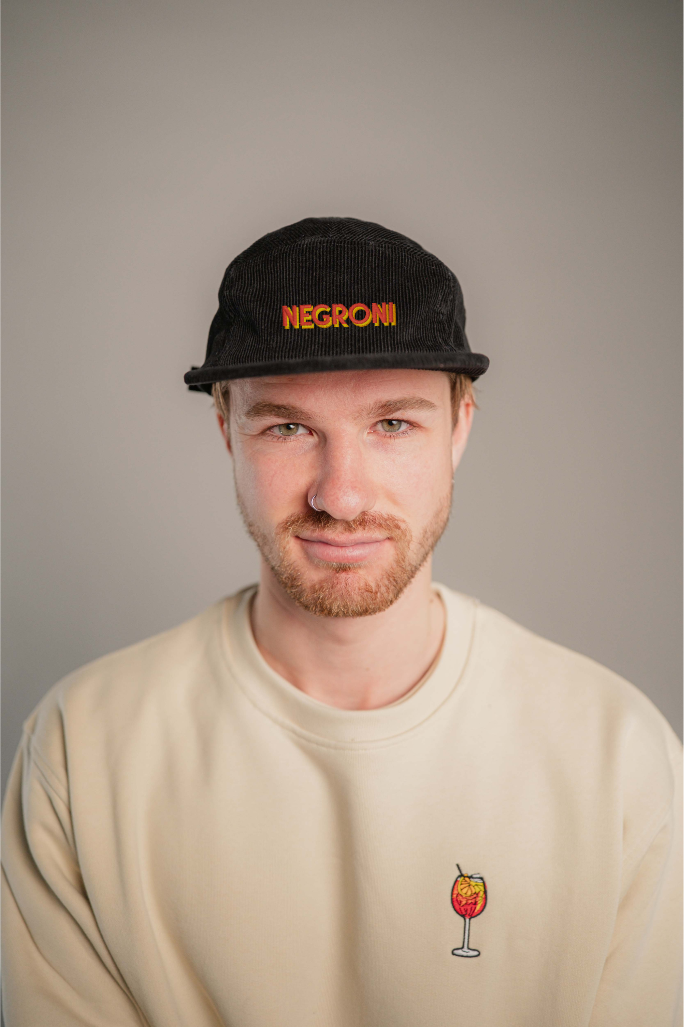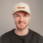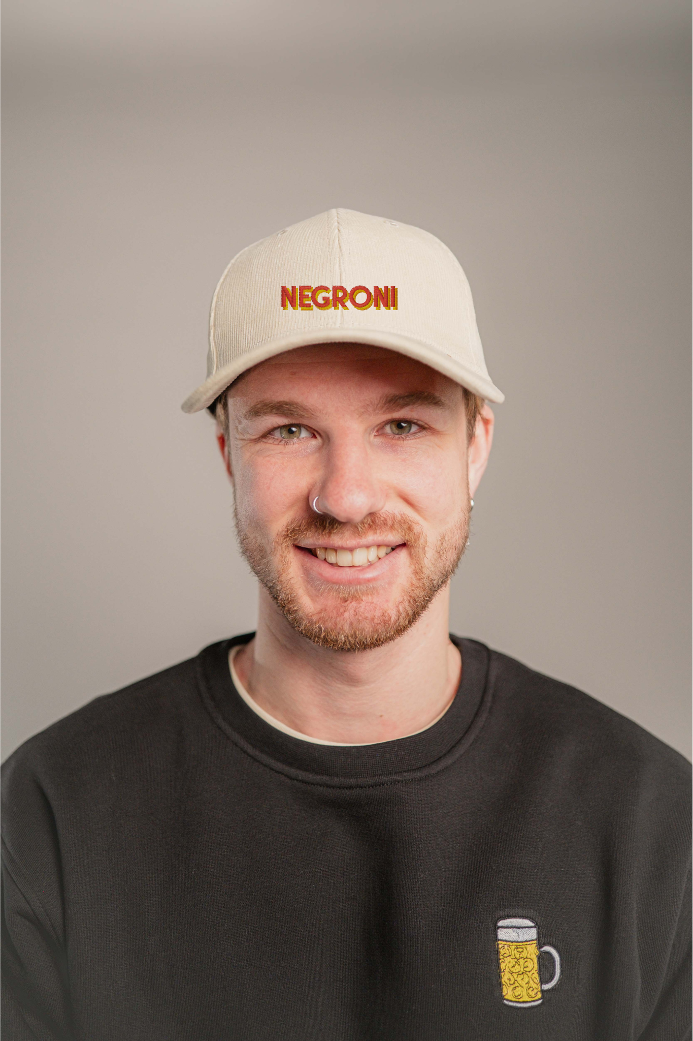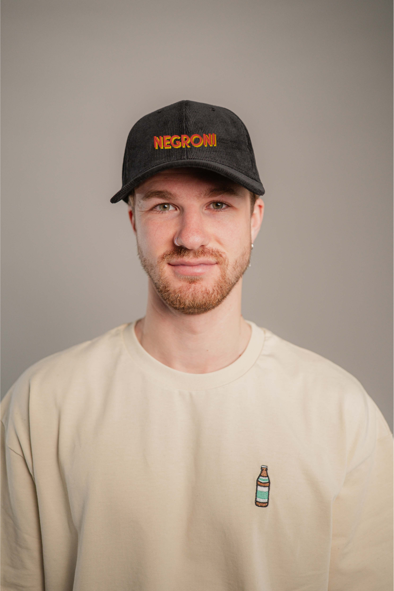 Super hochwertige Cord Cap aus 100% Bio Baumwolle mit gesticktem Negroni Signature Schriftzug vorne und kleinem gesticktem Negroni Tumbler seitlich