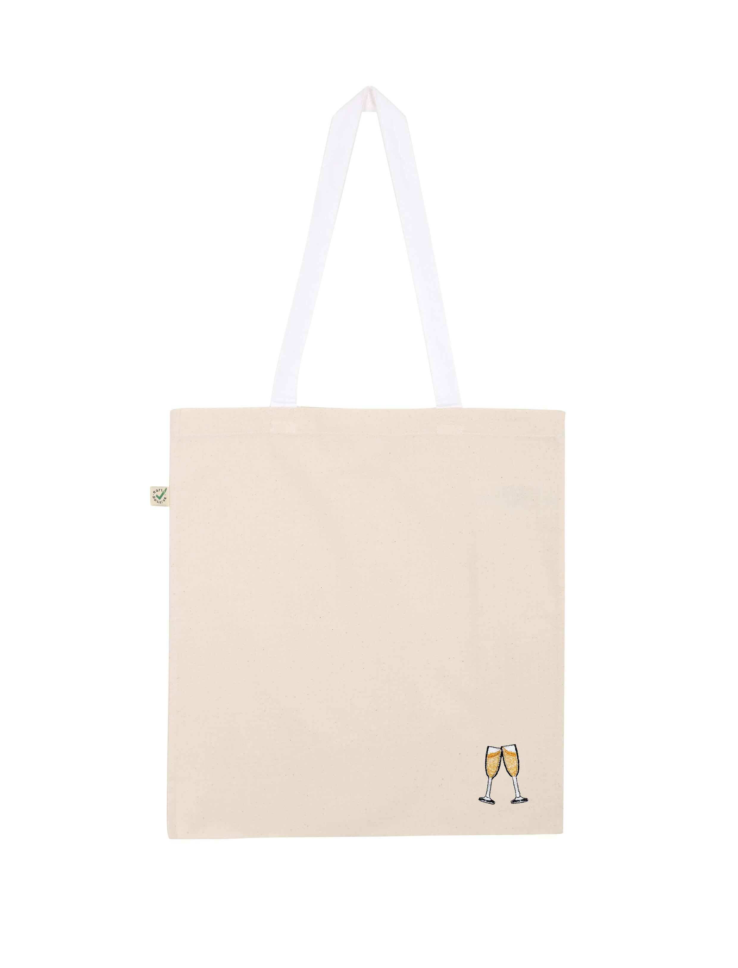 Bestickte, fair produzierte Bio-Baumwoll-Tragetasche im Sekt Design.