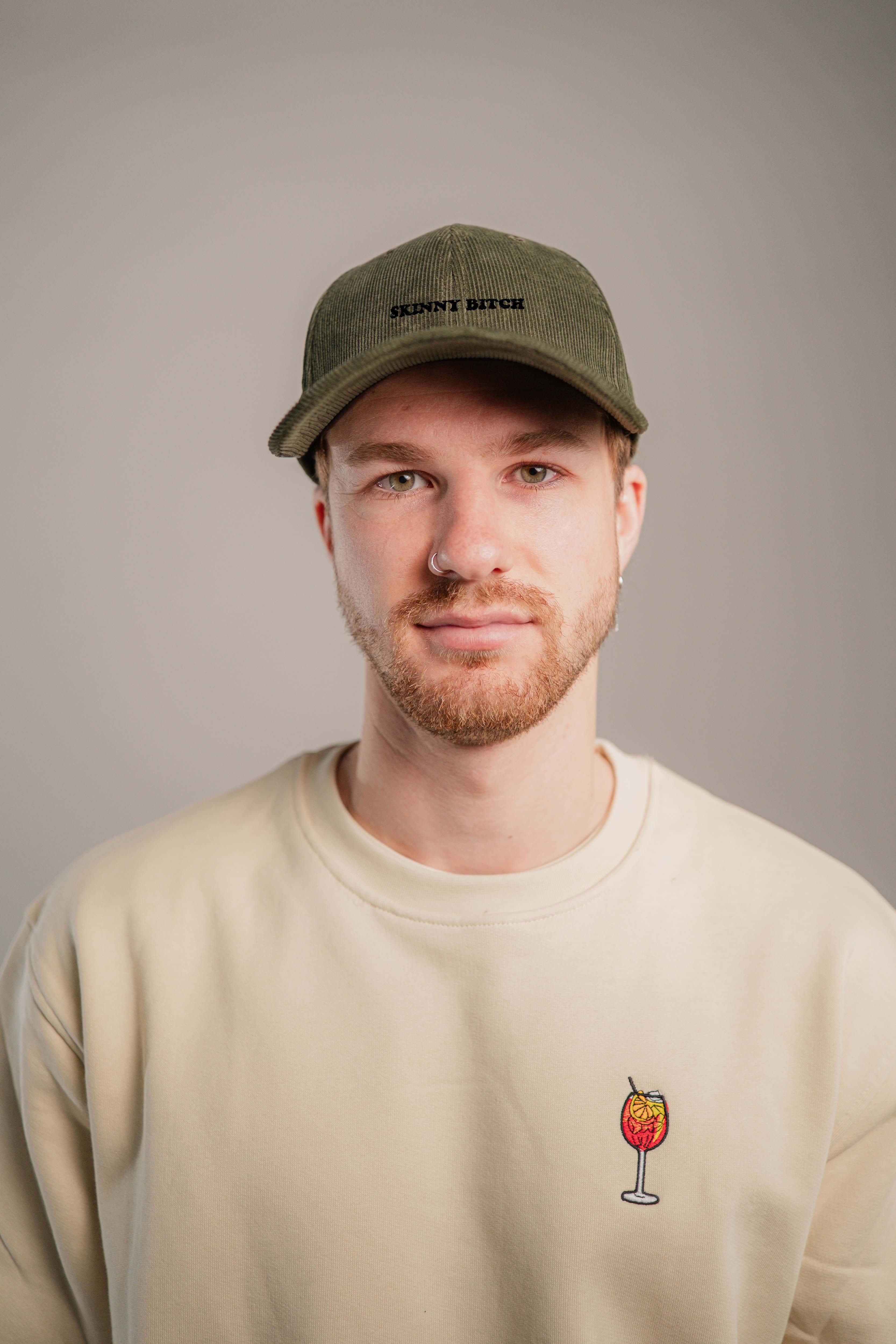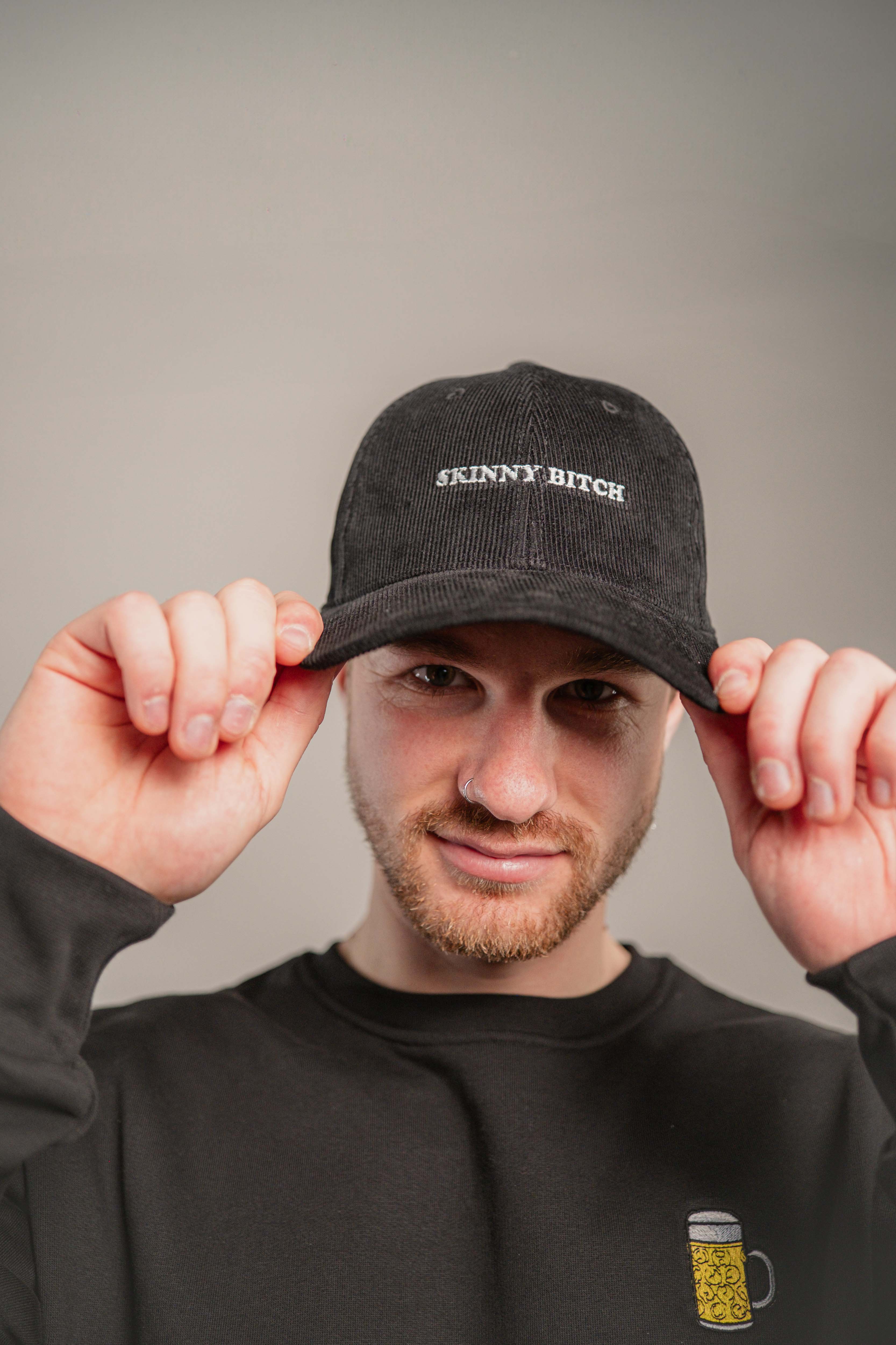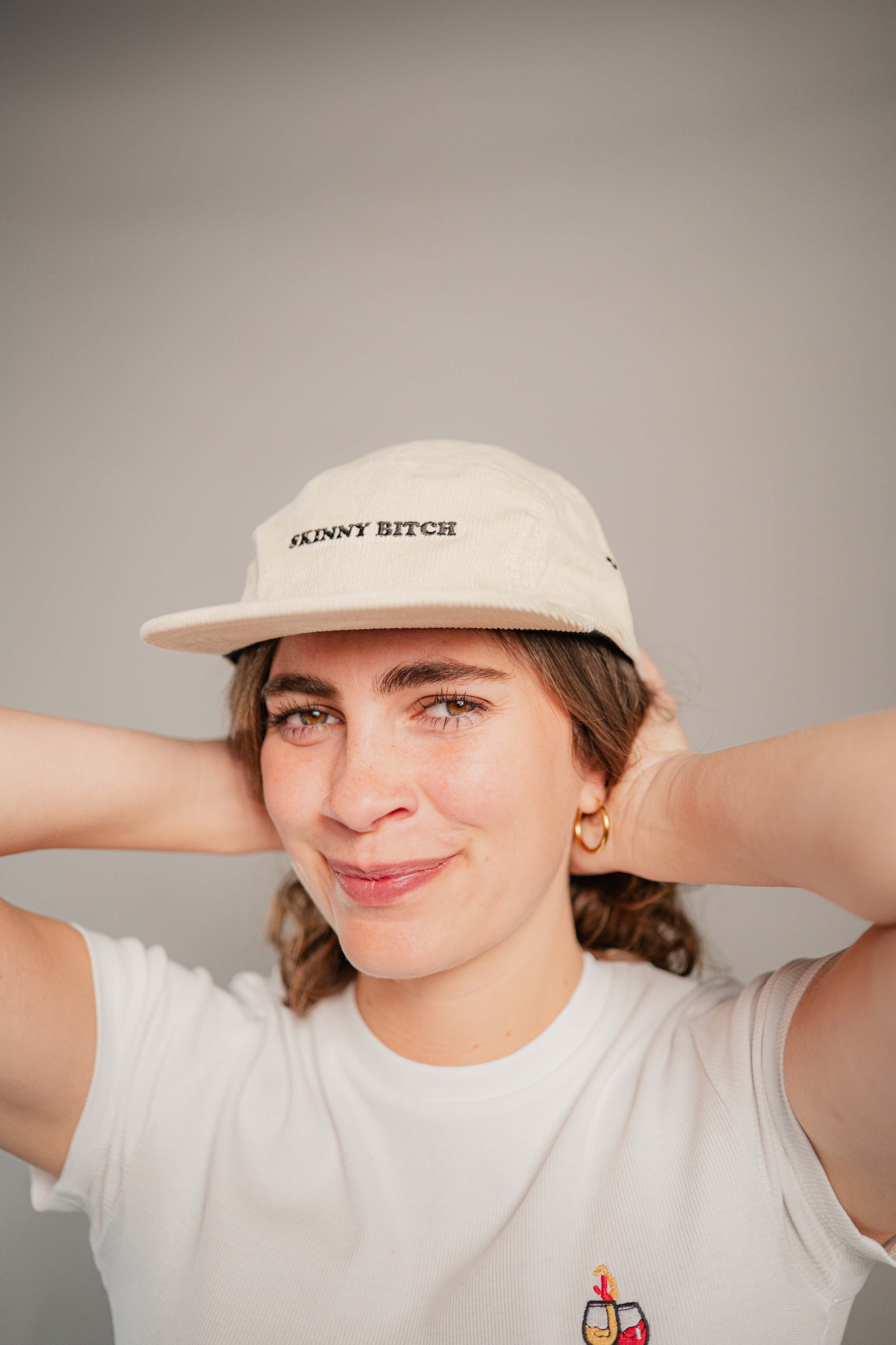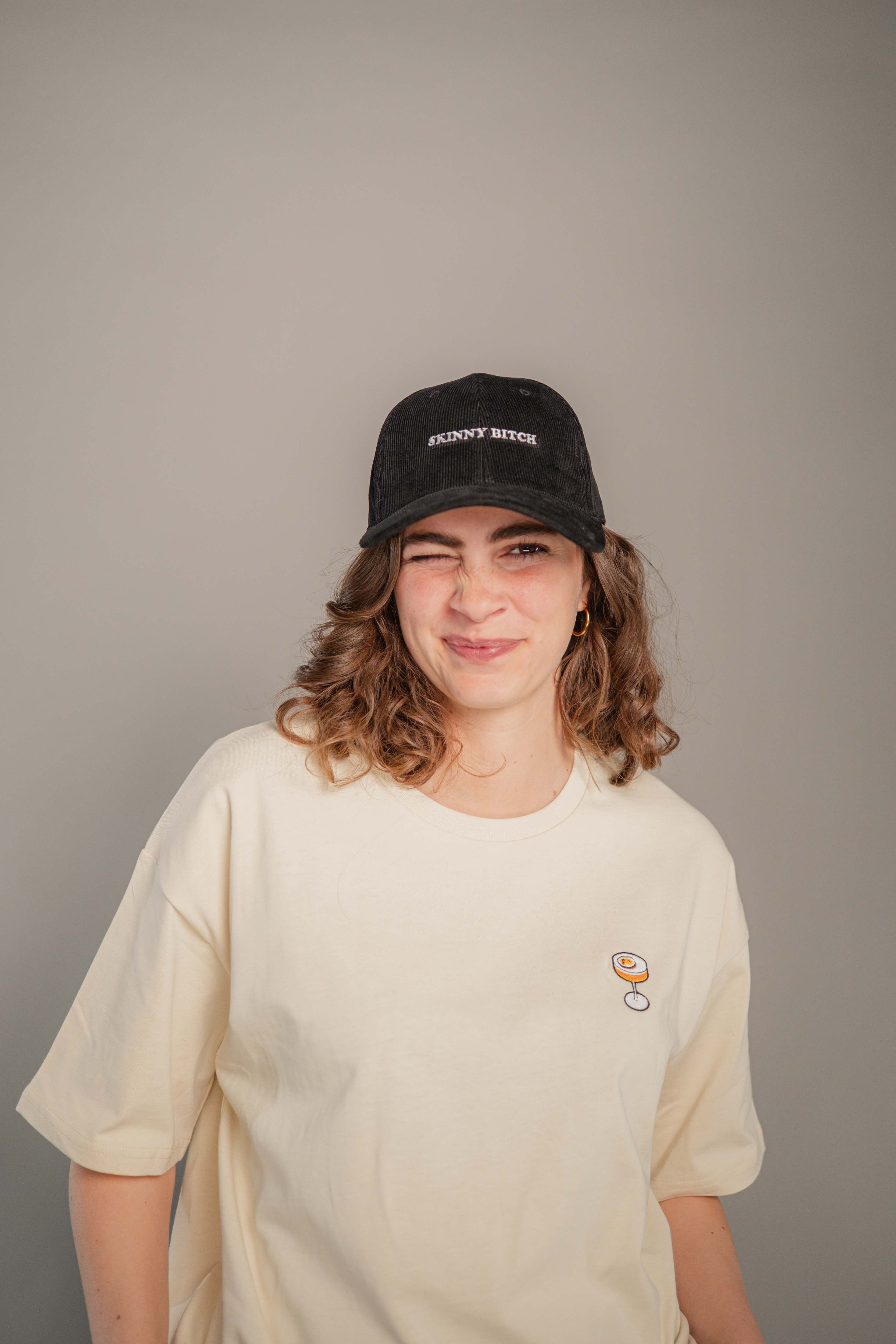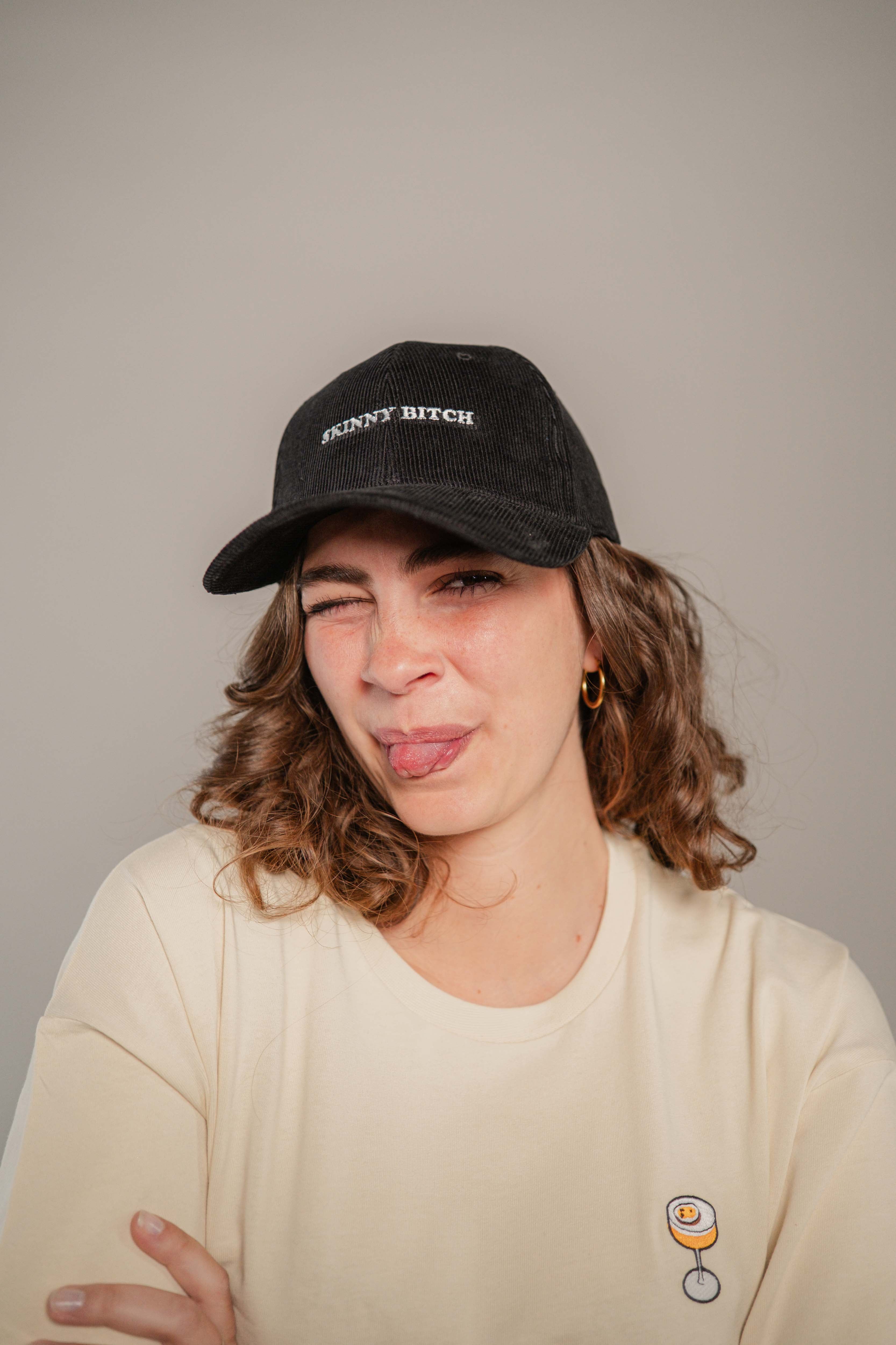 Super hochwertige Cord Cap aus 100% Bio Baumwolle mit gesticktem Skinny Bitch Schriftzug vorne und kleinem gesticktem Martini Glas seitlich