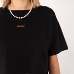 Super hochwertiges Bio Baumwoll Cropped T-Shirt mit gesticktem Spritz Signature Schriftzug in drei verschiedenen Schnitt-Varianten: Ripped, Regular & Oversized