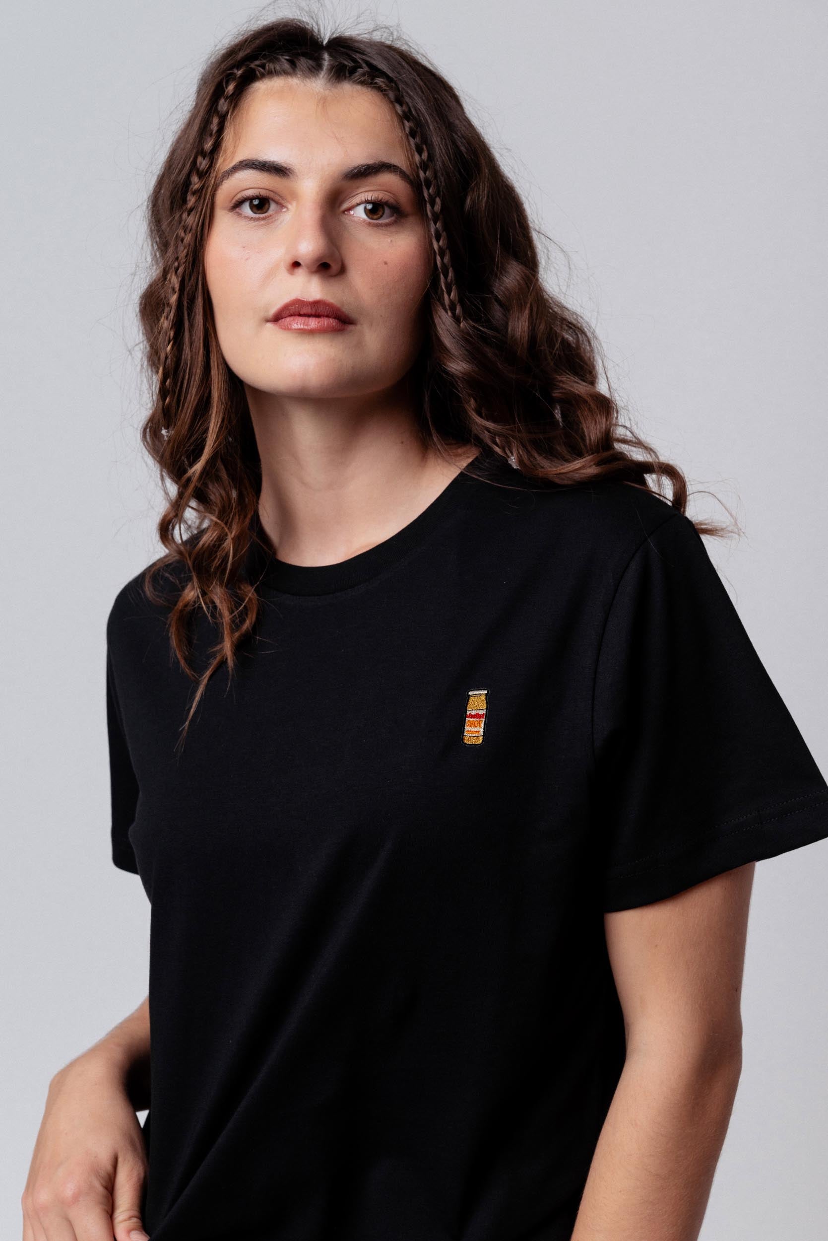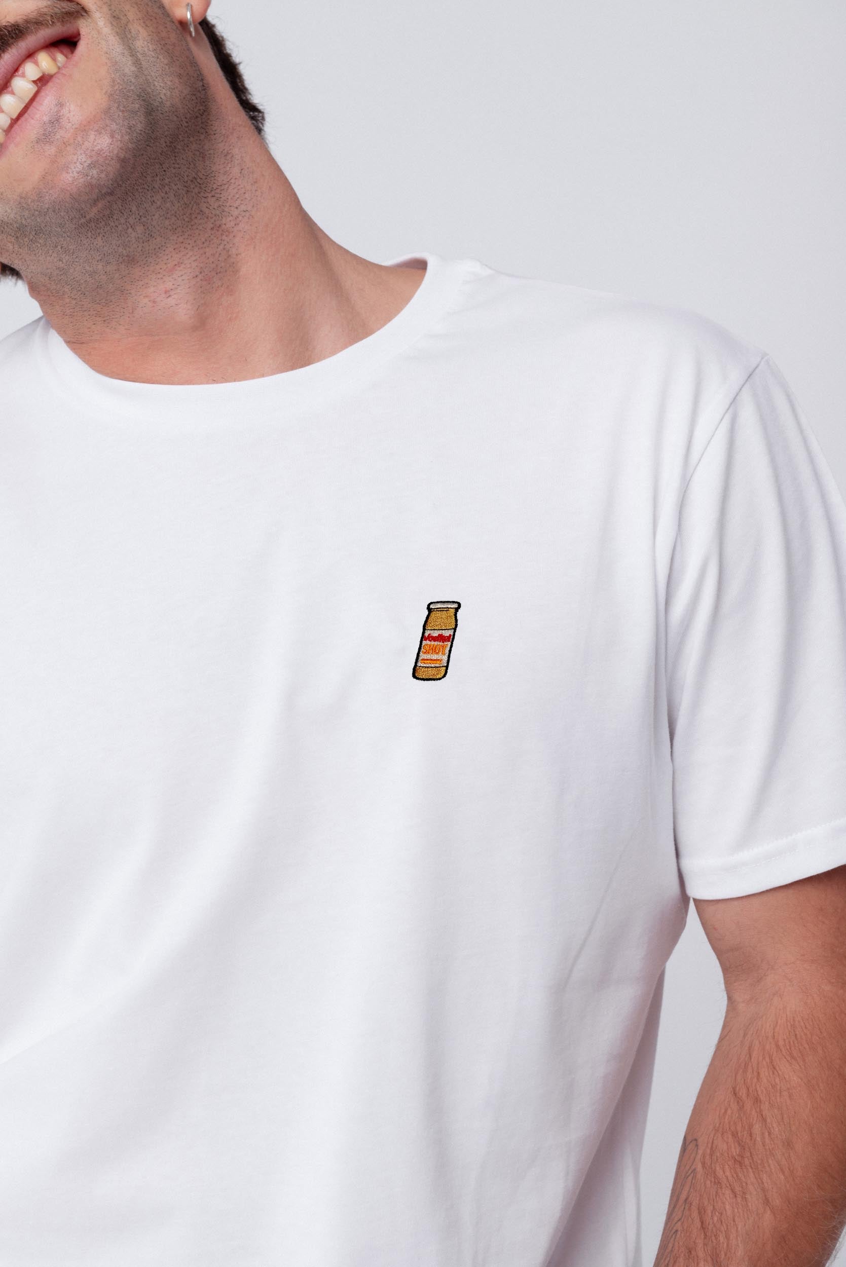 Besticktes Bio Baumwoll Unisex T-Shirt mit schwerem Stoff (190gsm) und offiziellem gesticktem Voelkel Ingwer Shot Design