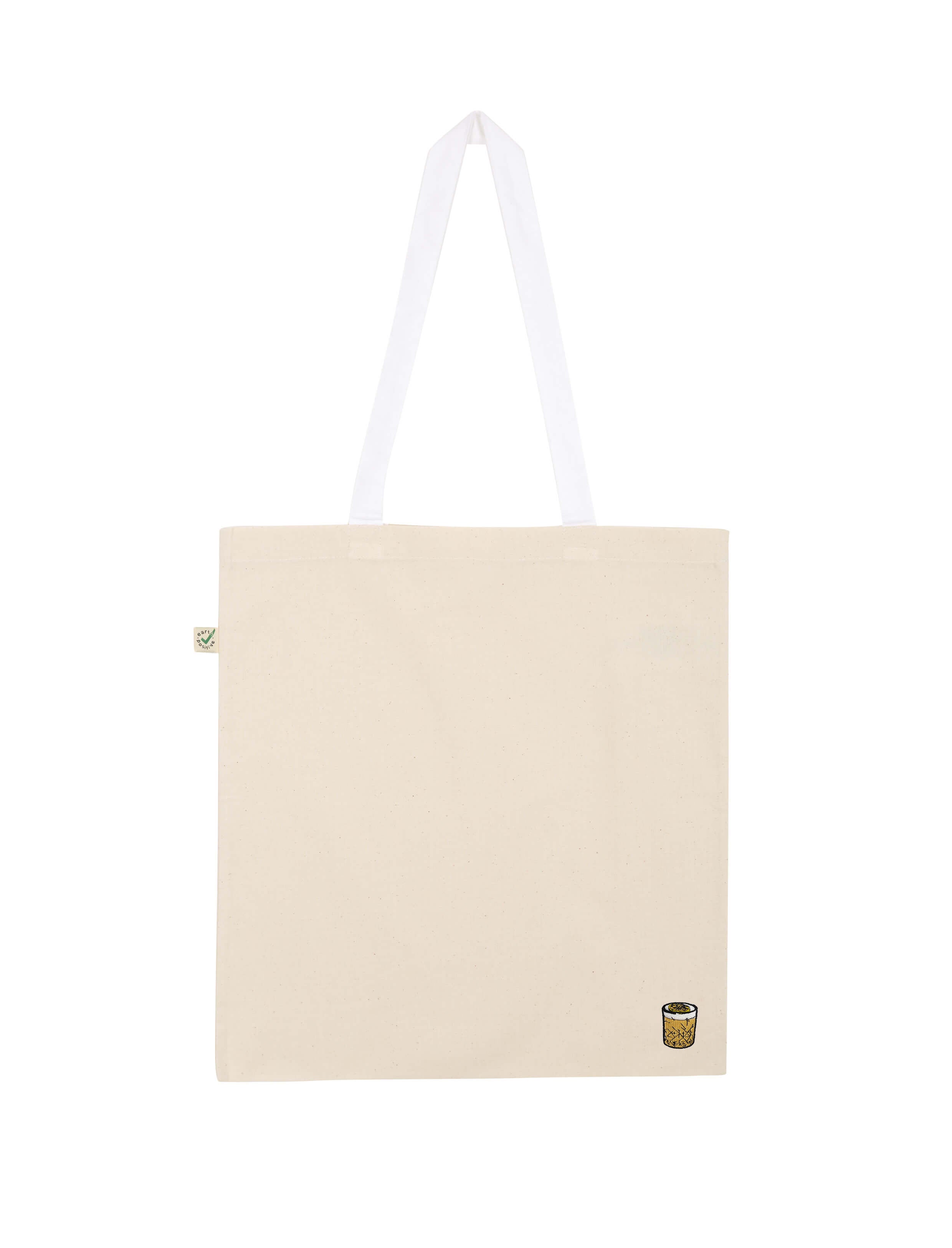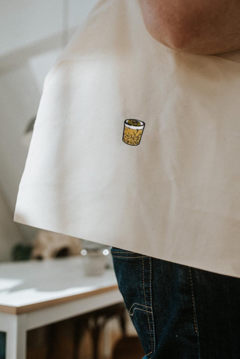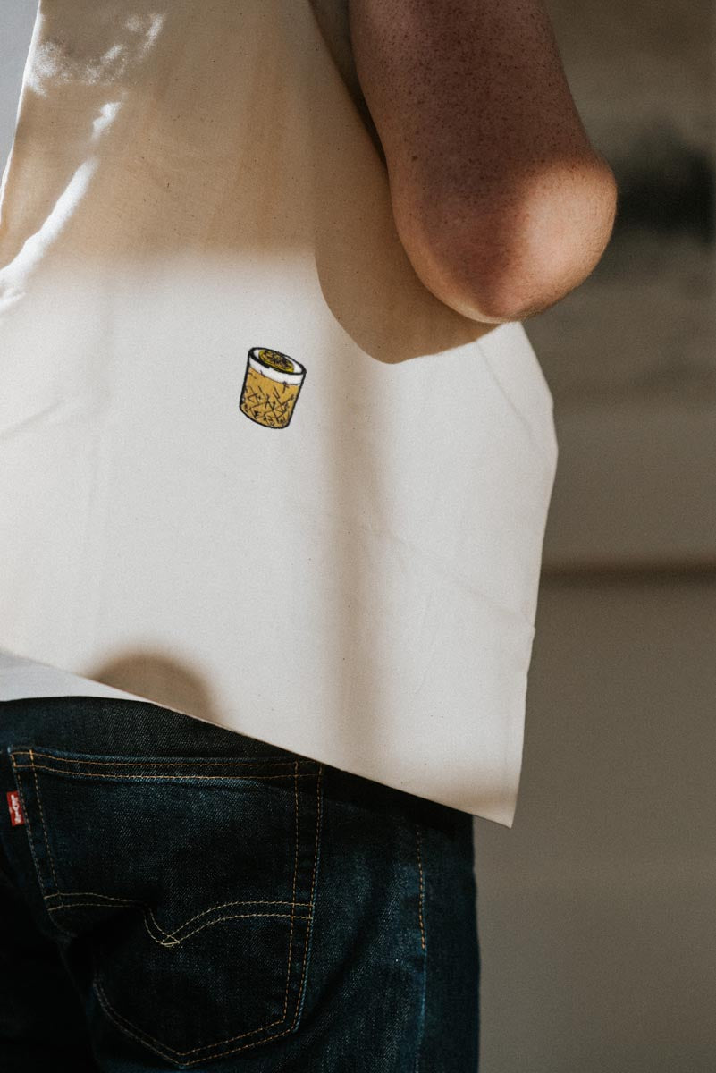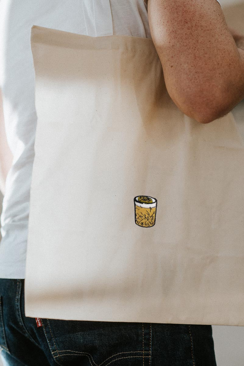 Bestickte, fair produzierte Bio-Baumwoll-Tragetasche im Whisky Sour Design.